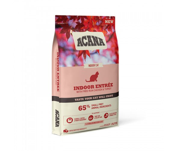 ACANA™ Indoor Entrée е специално разработена за домашни котки. С 65% висококачествени животински съставки като свободно отглеждани пилета, пуйки и цяла херинга, храната поддържа оптимално тегло чрез балансирани калории и L-карнитин. Съдържа фибри от овесени ядки, мискантус трева, леща и нахут за контрол на космените топки и пробиотици за здрава храносмилателна система. Произведена в Канада с подбрани съставки от цял свят.