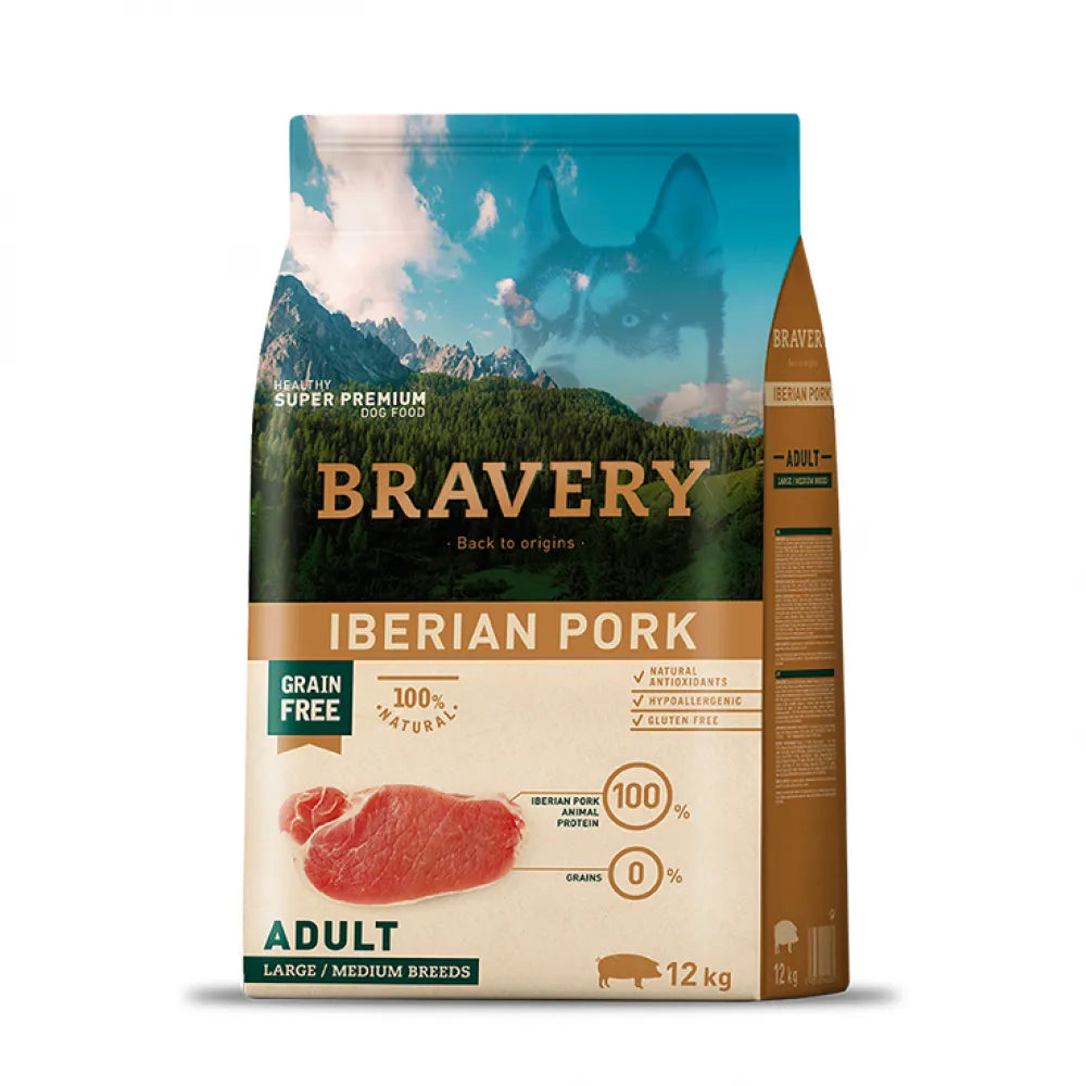 Bravery Iberian Pork Adult Medium & Large Breeds – пълноценна, хипоалергенна суха храна без зърнени култури, с единствен източник на животински протеин – иберийско свинско. Не съдържа изкуствени добавки. Подходяща за кучета с чувствителност.