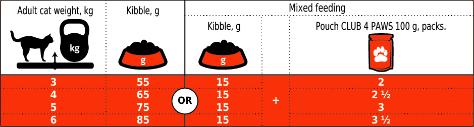 брашно от пиле 26 %, царевица, ориз, царевичен глутен, мазнини от домашни птици (с добавени токофероли), протеин хидролизиран животински, цвеклова каша, минерали, сьомгово масло 0,5 % бирена мая, ленено семе 0,27 %, банан* 0,23 %, домат* 0,2 %, глог* 0,065 %, джинджифил* 0,01 %.