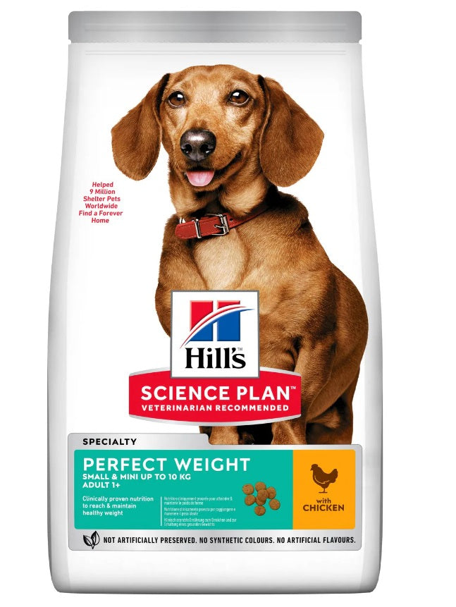 Hill's Science Plan Perfect Weight Small & Mini Adult е пълноценна храна с пилешко за кучета от малките породи (<10кг) над 1 год., с наднормено тегло или с тенденция за натрупване на тегло. Клинично доказано хранене за достигане и поддържане на здравословно тегло. Високопротеинова, богата на фибри формула, обогатена с L-карнитин и кокосово масло за поддържане на метаболизма.
