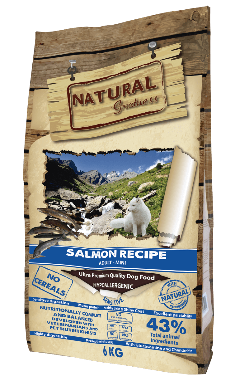 Natural Greatness Salmon Recipe Sensitive с първокласна суха храна с изискана сьомга, специално разработена за малки породи и кучета с алергични проблеми. Хипоалергенна рецепта съдържа само един източник на протеини - сьомга - и не съдържа зърнени култури, което я прави идеален избор за кучета с чувствителен стомах или проблеми с алергиите. Размерът на гранулите е идеално съобразен с възрастните кученца от малки породи, като осигурява лесно храносмилане и оптимално хранене.