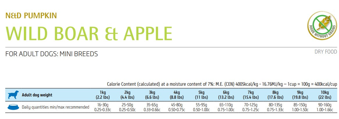 Farmina N&D Pumpkin Boar & Apple е пълноценна храна за кучета от дребни породи в зряла възраст с глиганско, тиква и ябълка, формулирана така, че да отговаря на хранителните нужди, установени от AAFCO за всички етапи от живота на кучето.