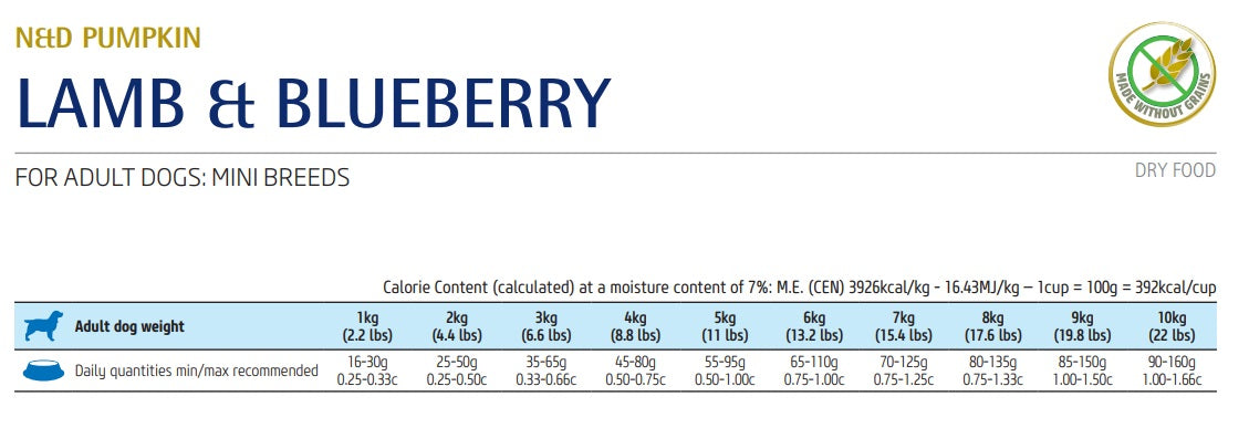 Farmina N&D Pumpkin Lamb & Blueberry е пълноценна храна за кучета от дребни породи в зряла възраст с агнешко, тиква и боровинки, формулирана така, че да отговаря на хранителните нужди, установени от AAFCO за всички етапи от живота на кучето.