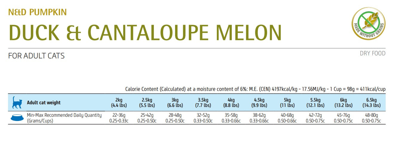 Farmina N&D Pumpkin Duck & Cantaloupe е пълноценна храна за котки в зряла възраст с патица, тиква и пъпеш, формулирана така, че да отговаря на хранителните нужди, установени от AAFCO за всички етапи от живота на котката.