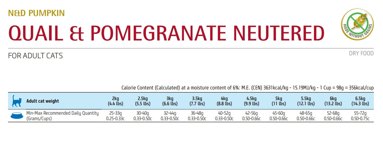 Farmina N&D Pumpkin Quail & Pomegranate Neutered е пълноценна храна за кастрирани котки с пъдпъдък, тиква и нар, формулирана така, че да отговаря на хранителните нужди, установени от AAFCO за всички етапи от живота на котката.