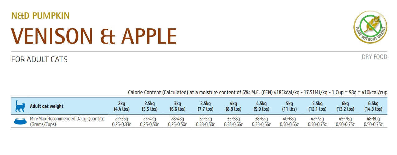 Farmina N&D Pumpkin Venison & Apple е пълноценна храна за котки в зряла възраст с еленско, тиква и ябълки, формулирана така, че да отговаря на хранителните нужди, установени от AAFCO за всички етапи от живота на котката.