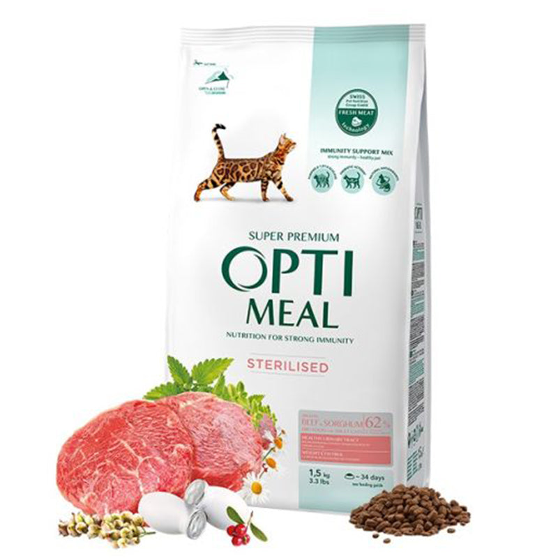 Opti Meal Adult Cat Sterilised with Beef and Sorghum - За кастрирани котки над 12 месеца с говеждо и сорго 1.5 кг/10 кг
