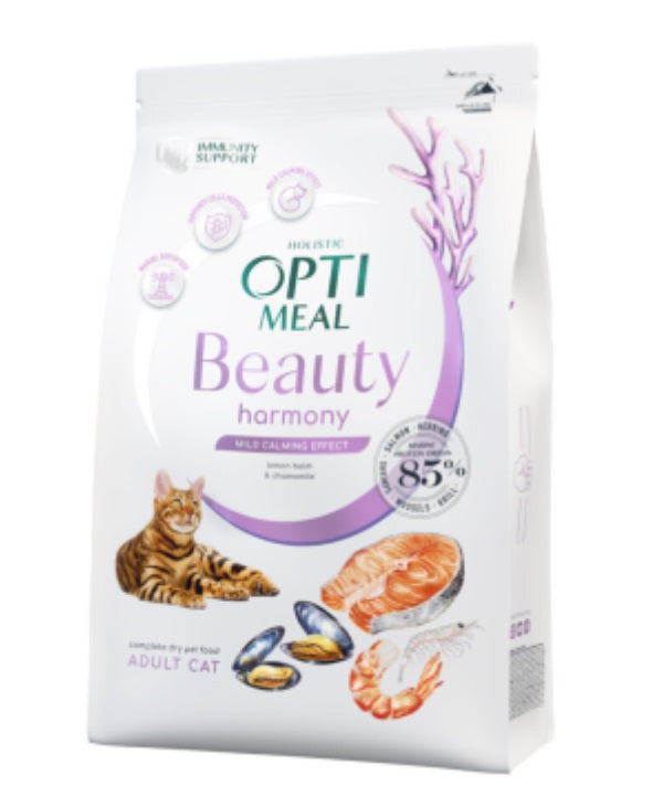 OPTIMEAL Beauty Harmony Mild Calming Effect за КОТКА е храна, която е специално създадена да осигури спокоен дух на вашия котка, без да предизвиква натрупване на мазнини.