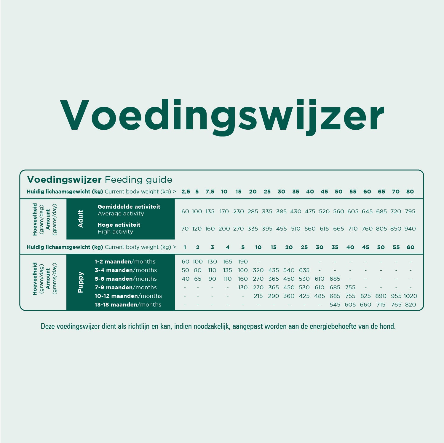 Подходяща за кучета на възраст между 6 месеца и 8 години. Разделяйте дневната порция на минимум две хранения. Осигурете постоянен достъп до прясна вода.