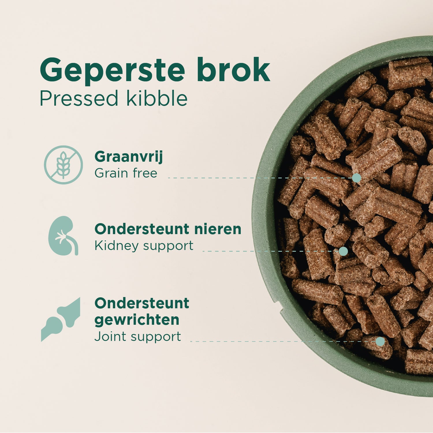 Картофено нишесте, дехидратирано пилешко месо, грах, животинска мазнина (говежда), тапиока, цикория, малтодекстрин, протеинов хидролизат, масло от сьомга (1,0%), хемоглобин, растителни фибри, мая (хидролизат), минерали (калиев хлорид), слънчогледово масло, лецитин, глюкозамин (500 mg), хондроитин (500 mg), фруктоолигозахариди (FOS) (400 mg).