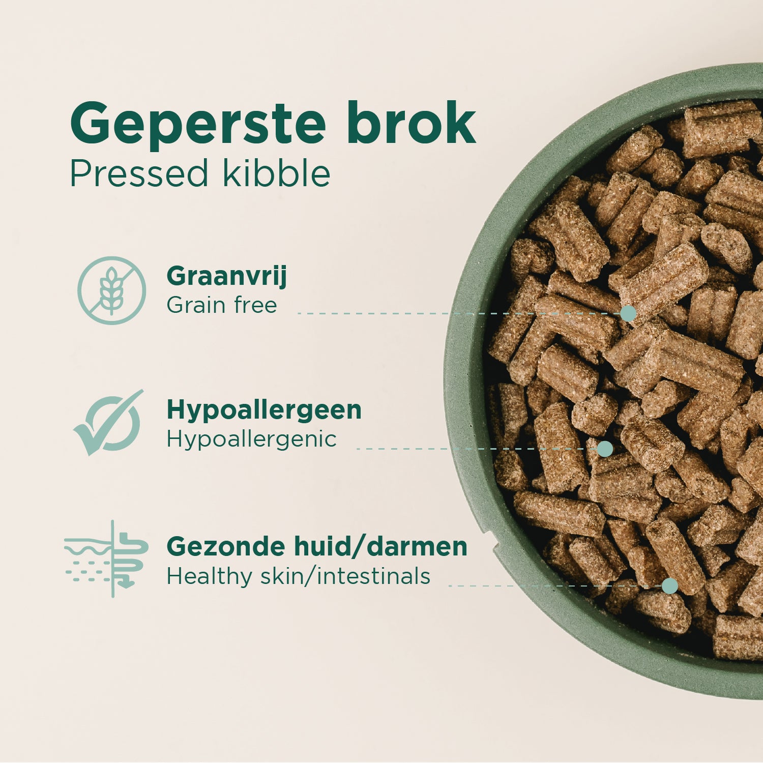 Хипоалергенна, беззърнена храна с патешко месо – отлично решение за кучета с чувствителна кожа, козина или храносмилане. Подпомага чревната флора с натурални фибри и осигурява добра усвояемост и комфорт.