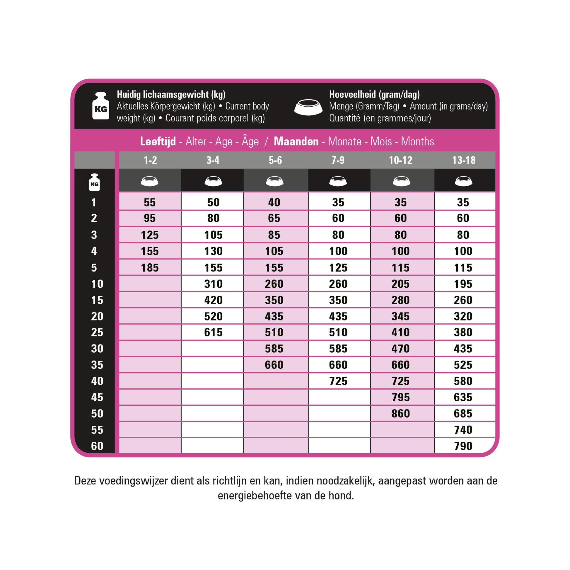 Пълноценна храна за подрастващи кучета от средни и едри породи (4 седм. – 12 месеца). Подпомага здравословното развитие на костите, ставите и сърдечната дейност. Обогатена с масло от сьомга, FOS, пробиотици, билки и Шуслерови соли за цялостна подкрепа на организма.