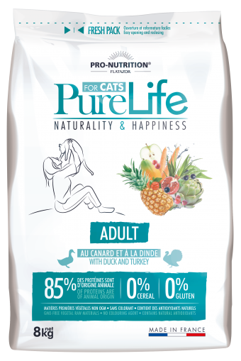 Коментар на ЗооХранител: Pure Life е ултрапремиум клас храна. Без зърно. С изключително висок процент животински протеин, който е лесно и пълноценно усвояем от котките. Произвежда се във Франция, а всички съставки се добиват от областта Бретан, което е екологично чист регион (като нашата "Натура 2000").