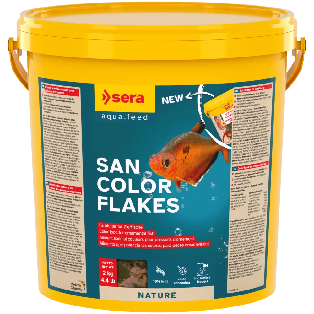 sera San Nature е цветна храна без оцветители и консерванти за всички декоративни риби, които се хранят на повърхността на водата. Развитието на цвета се засилва изключително от естествени съставки като водораслите Haematococcus, богати на астаксантин, и крил. В същото време те подобряват приемливостта, жизнеността и готовността за хвърляне на хайвер на декоративните риби. Люспите запазват формата си за дълго време и не помътняват водата.